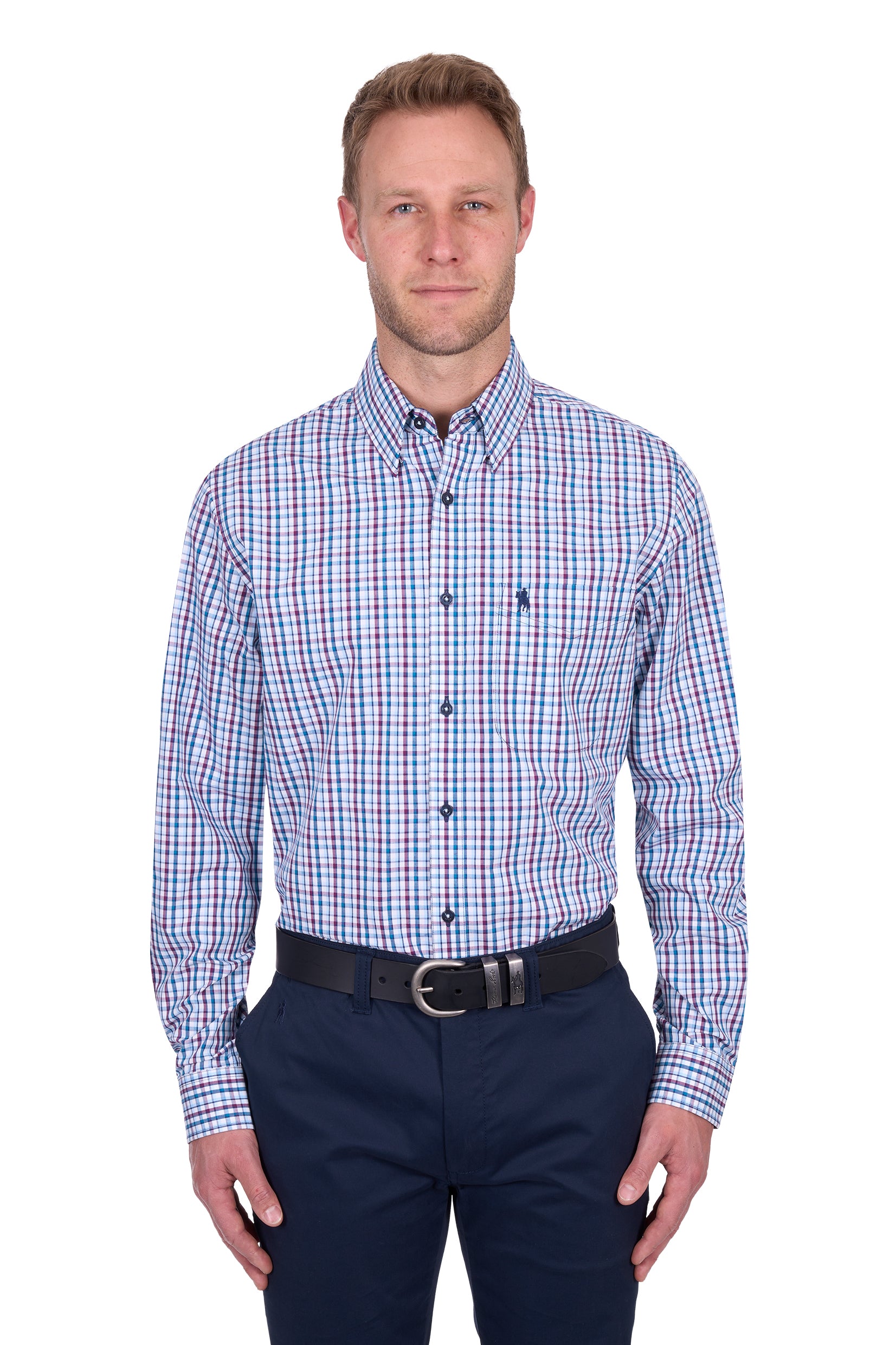The Joe Shirt offers a refined blend of style and function. Crafted from easy-care fabric, it features a long sleeve design with a long shirt tail and a back pleat for enhanced comfort and freedom of movement. Details include contrast chambray facing inside the collar stand, concealed collar peak buttons, and removable collar stays for a crisp appearance. A subtle horseman embroidery on the chest pocket adds a distinctive touch, making this shirt an expert choice for a polished yet practical wardrobe.