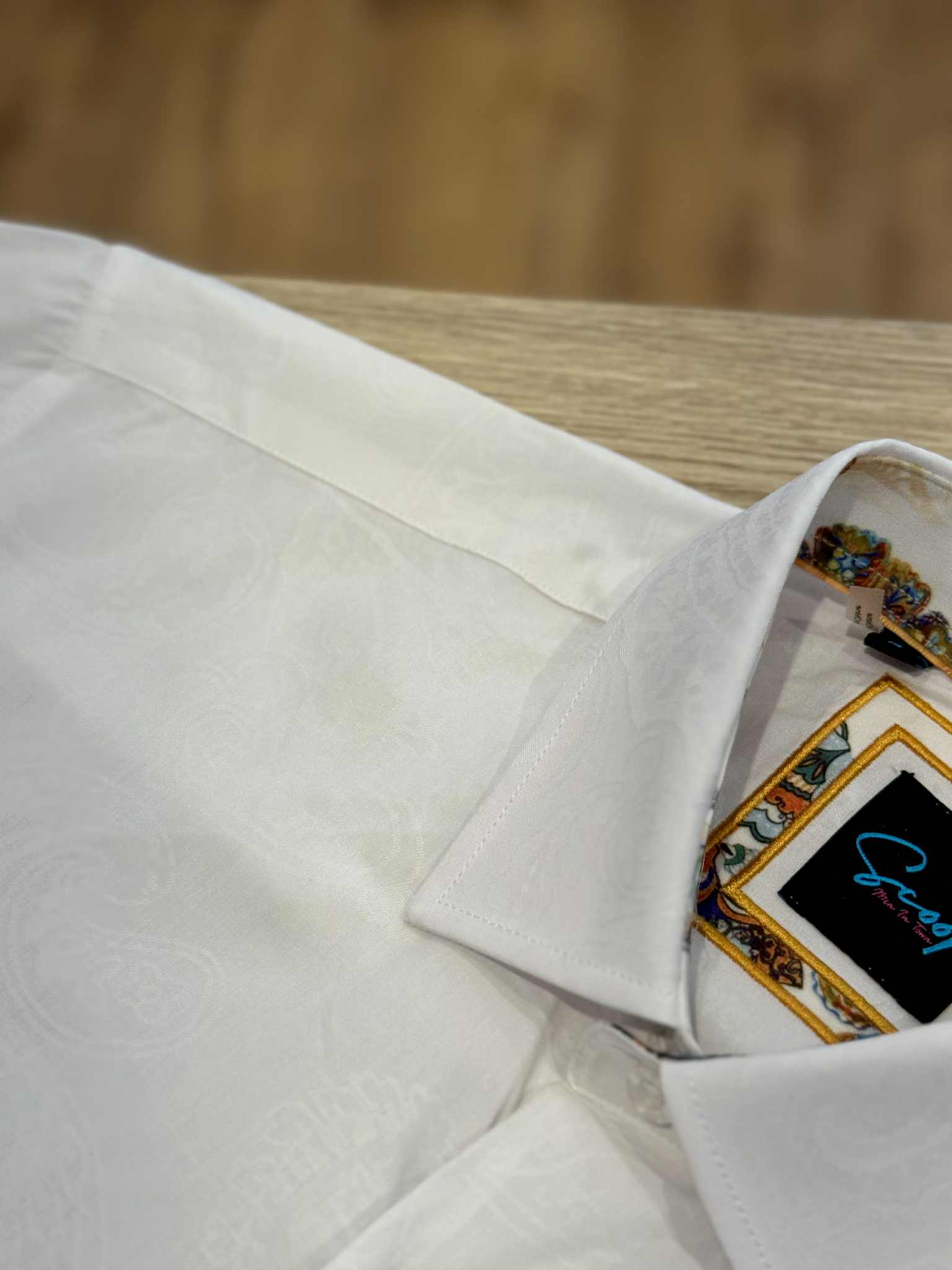 This white paisley dress shirt features a subtle self-embossed pattern that adds refined texture without overpowering its classic look. Crafted from high-quality cotton, it ensures breathability and comfort throughout the day. The slim fit design offers a modern silhouette, making it an excellent choice for both professional settings and special occasions where sharp presentation matters.